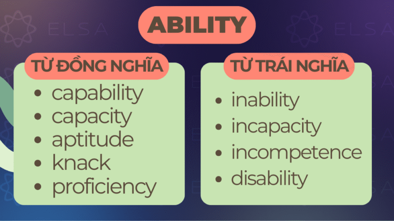 Trong tiếng Anh, “ability” là một danh từ quen thuộc mang ý nghĩa khả năng, năng lực làm việc gì đó. Tuy nhiên, không phải ai cũng biết cách sử dụng “ability” đúng chuẩn, đặc biệt là khi kết hợp…