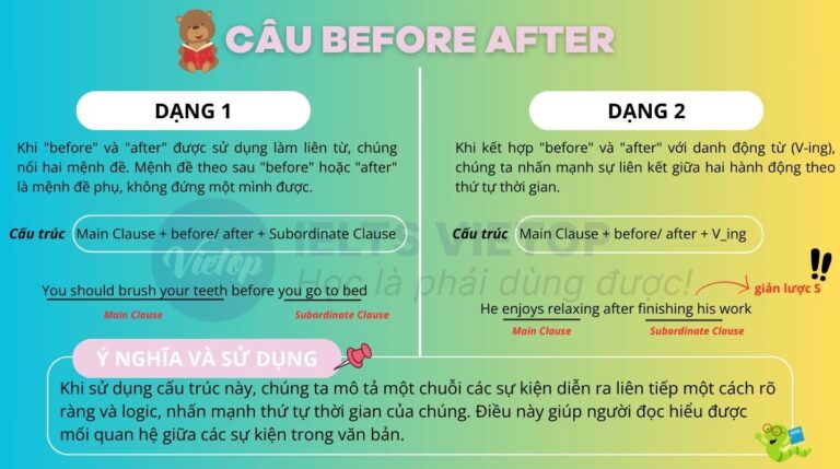 Trong tiếng Anh, việc sử dụng đúng các từ nối như “after” và “before” giúp câu văn trở nên mạch lạc, rõ ràng hơn khi diễn tả thứ tự diễn ra của các sự việc. Tuy đơn giản nhưng không…
