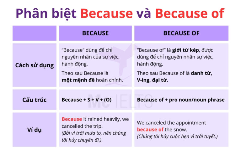 Trong tiếng Anh, việc liên kết các mệnh đề để diễn đạt nguyên nhân – kết quả là vô cùng quan trọng. Hai liên từ phổ biến được sử dụng cho mục đích này là “because” và “so”. Tuy nhiên,…