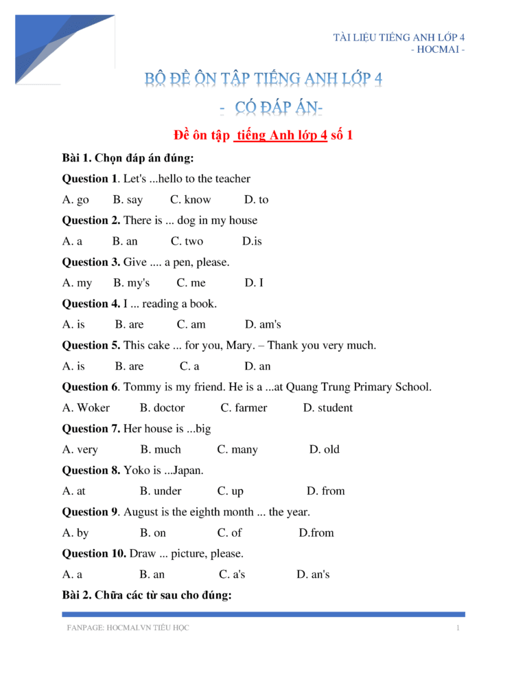 Tiếng Anh ngày càng trở thành môn học quan trọng đối với học sinh tiểu học, đặc biệt là các em lớp 4. Để hỗ trợ các em rèn luyện và nâng cao kiến thức, việc làm bài tập tiếng…
