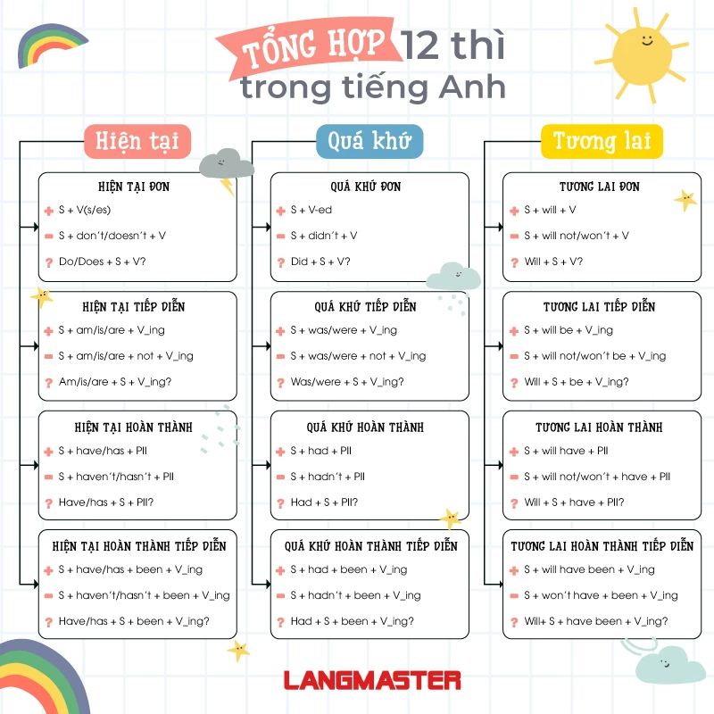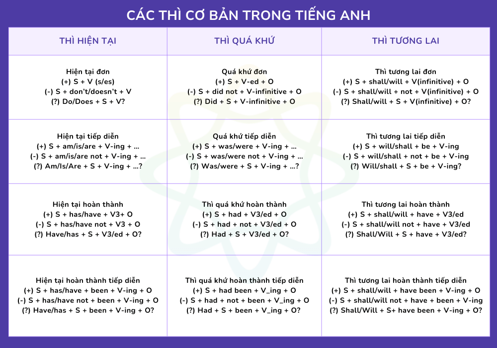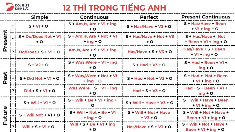 Tiếng Anh có hệ thống thì đa dạng, đóng vai trò quan trọng trong việc truyền đạt thời gian và trạng thái của hành động. Việc nắm vững 12 thì tiếng Anh sẽ giúp bạn diễn đạt ý tưởng một cách chính xác, tự tin hơn trong giao tiếp cũng như làm bài thi. Mỗi thì đều có cấu trúc, cách dùng riêng phù hợp với từng hoàn cảnh khác nhau. Trong bài viết dưới đây, chúng ta sẽ cùng tìm hiểu chi tiết về 12 thì tiếng Anh đầy đủ nhất, giúp bạn hệ thống lại kiến thức một cách rõ ràng, dễ nhớ và vận dụng hiệu quả trong thực tế.