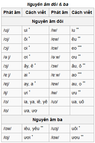 Chẳng hạn, nguyên âm uô có thể được ghi bằng các chữ cái như a, ă, â, i/y, o, ô, ơ, e, ê, u, và ư. Tổng cộng có 32 nguyên âm đôi khác nhau, trong đó bao gồm những âm như ai, ao, au, ay, âu, ây, ia, và iê/yê. Đây là điểm đặc biệt khi chúng ta học tiếng Việt, vì mỗi nguyên âm đôi lại mang một âm sắc và nghĩa khác nhau.