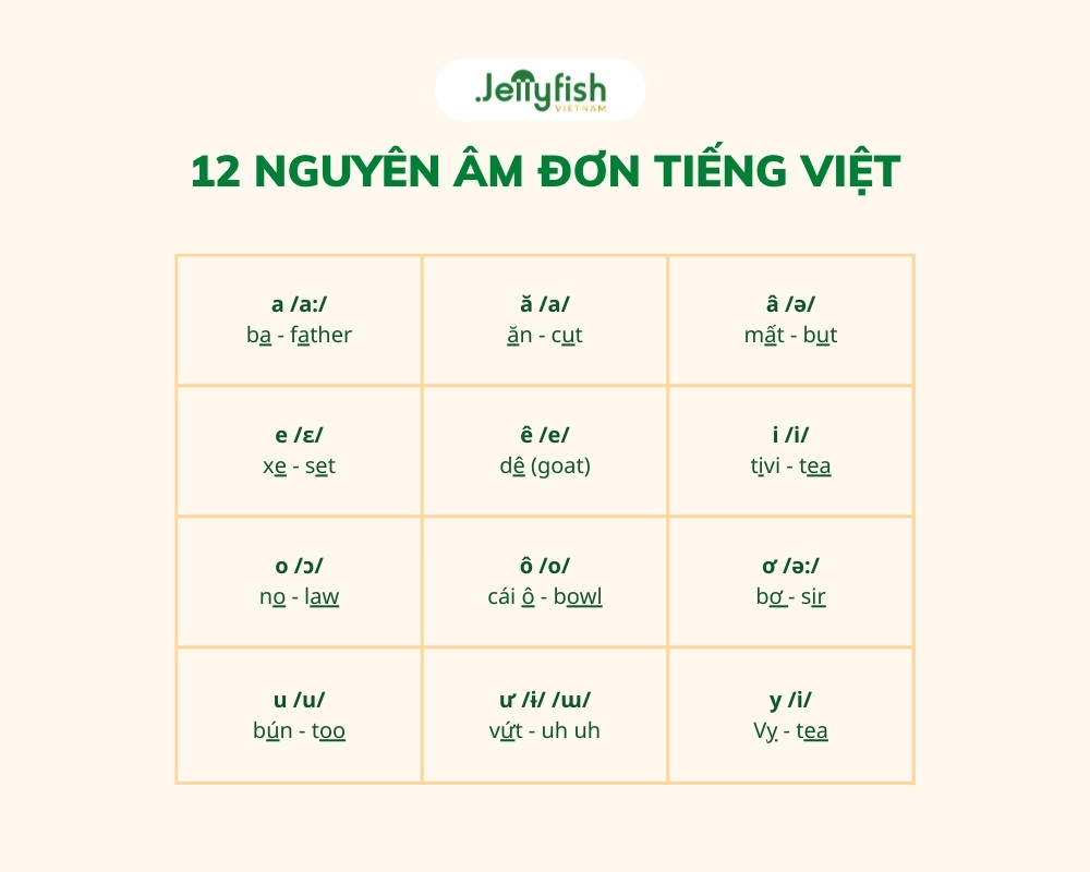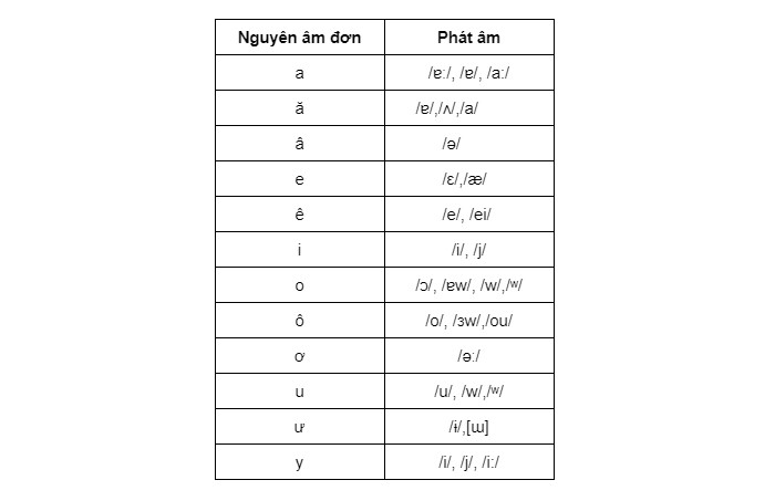 Tiếng Việt là một ngôn ngữ phong phú với hệ thống âm vị đa dạng, bao gồm 11 nguyên âm đơn và 32 nguyên âm đôi. Các nguyên âm đơn bao gồm: a, ă, â, e, ê, i, o, ô, ơ, u, ư và y, tạo nên nền tảng cho cách phát âm và viết chữ trong tiếng Việt.