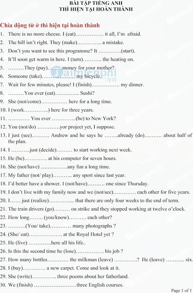 Bài Tập Thì Hiện Tại Hoàn Thành