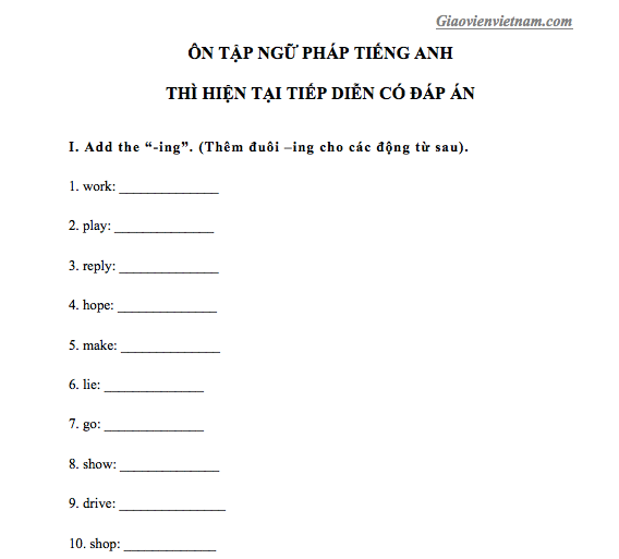 Ngoài ra, bài tập về thì hiện tại tiếp diễn rất đa dạng và phong phú, từ cơ bản đến nâng cao. Bạn có thể tìm thấy các bài tập trắc nghiệm, điền từ, hay viết lại câu, giúp củng cố kiến thức một cách hiệu quả. Các bài tập này không chỉ giúp bạn làm quen với cấu trúc câu mà còn cải thiện khả năng sử dụng thì trong giao tiếp hàng ngày.