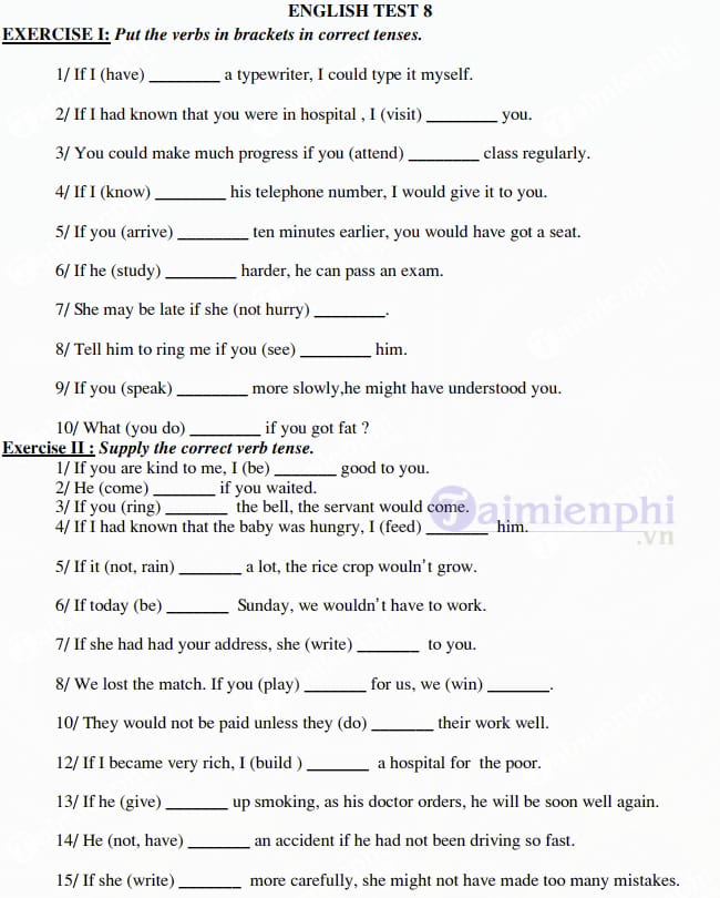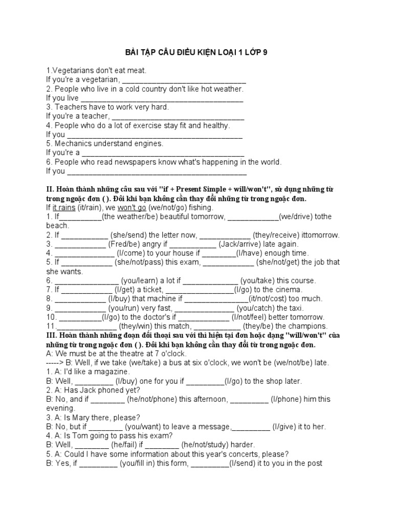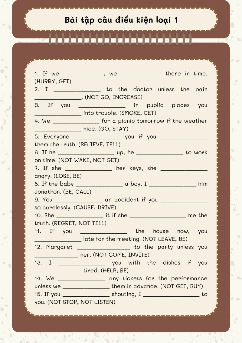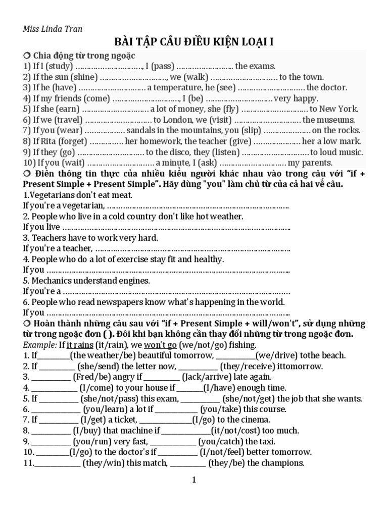 Để giúp học sinh rèn luyện kỹ năng sử dụng câu điều kiện loại 1, có rất nhiều bài tập đa dạng với cấp độ từ cơ bản đến nâng cao. Những bài tập này không chỉ giúp củng cố kiến thức mà còn kích thích khả năng sáng tạo khi viết câu. Hãy thử sức với 50 bài tập câu điều kiện loại 1 để nâng cao khả năng ngôn ngữ của mình nhé!