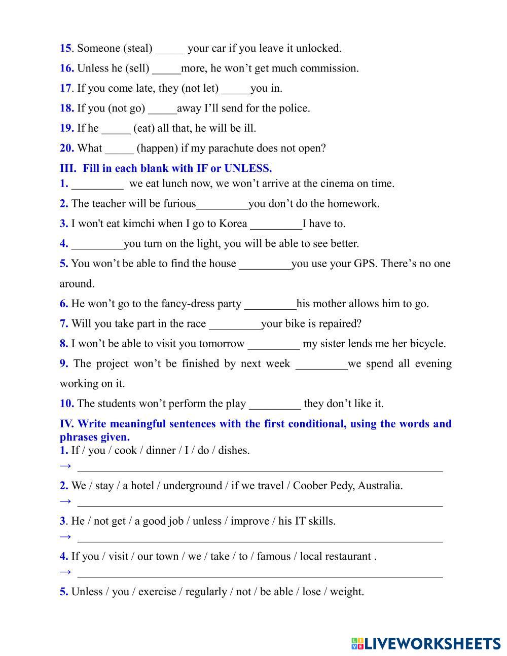 Trong quá trình học tập, việc luyện tập câu điều kiện loại 1 rất quan trọng. Nó không chỉ giúp củng cố kiến thức mà còn phát triển khả năng giao tiếp. Những bài tập đa dạng sẽ giúp học sinh làm quen với cách sử dụng câu điều kiện qua nhiều bối cảnh khác nhau. Chúng ta có thể gặp những ví dụ như: “If you help me, I will be grateful” (Nếu bạn giúp tôi, tôi sẽ rất biết ơn).