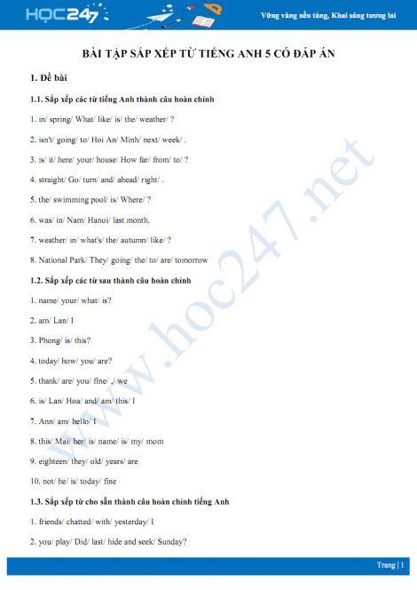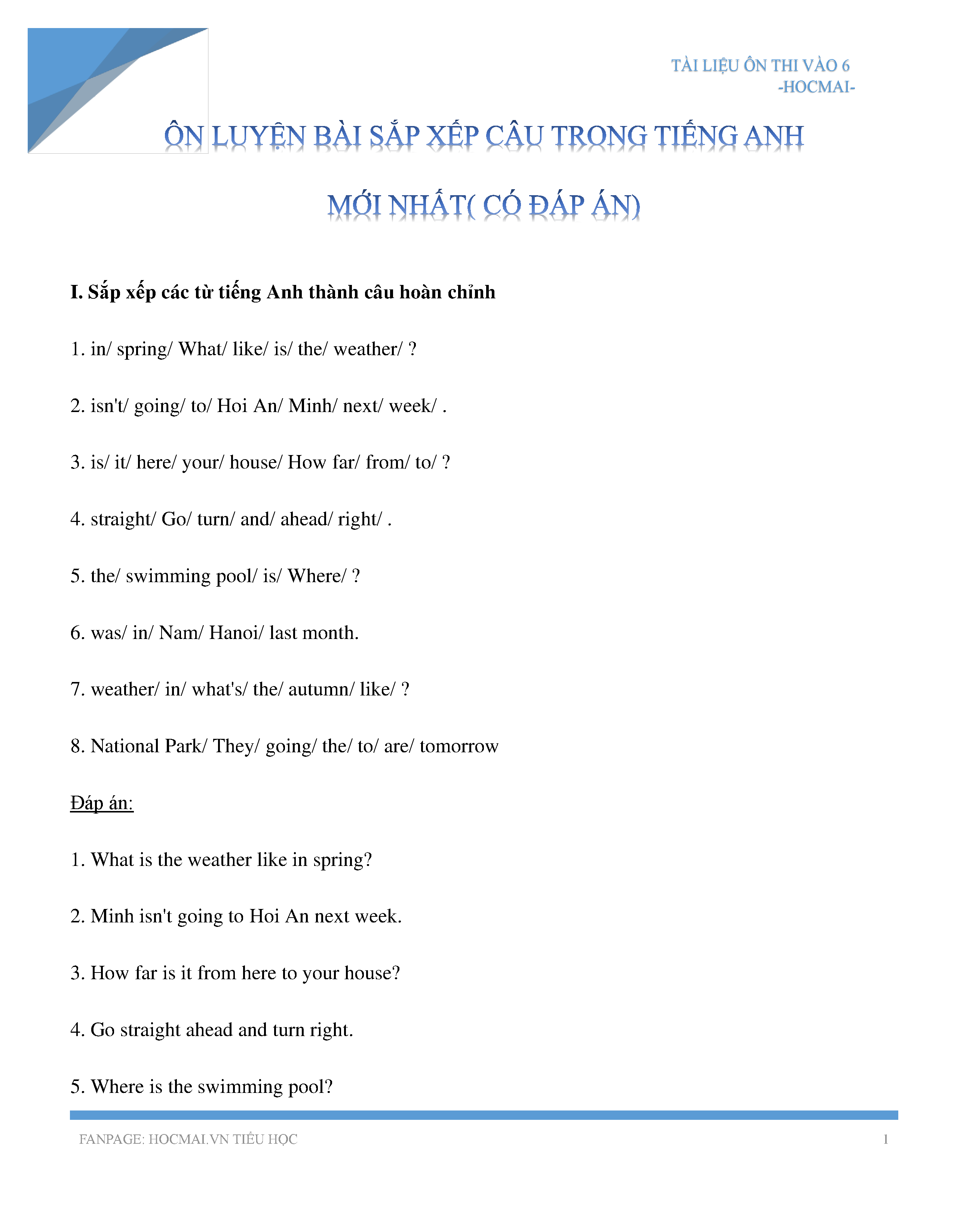 Ngoài việc cung cấp lý thuyết và hướng dẫn cách làm, bộ bài tập còn đi kèm với đáp án để các em có thể tự kiểm tra và đánh giá khả năng của mình. Với 50 câu bài tập sắp xếp từ khác nhau, các em hãy cùng tập luyện để tiến bộ hơn trong việc sử dụng tiếng Anh nhé!