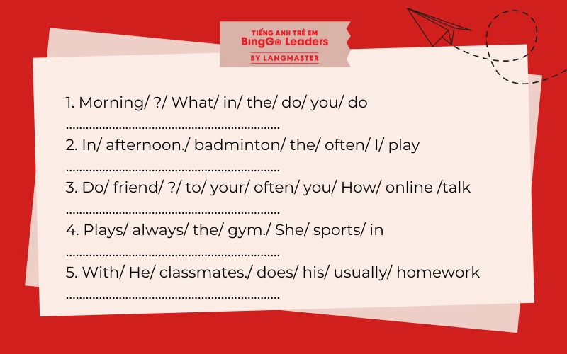 Đặc biệt, các bài tập này không chỉ dừng lại ở lý thuyết mà còn giúp các em thực hành kỹ năng giao tiếp tiếng Anh hàng ngày, tạo nền tảng vững chắc cho việc học sau này. Với những bí kíp sắp xếp câu đơn giản và hiệu quả, các em hoàn toàn có thể “công phá” dạng bài này trong thời gian ngắn. Hãy cùng nhau khám phá và luyện tập nhé!