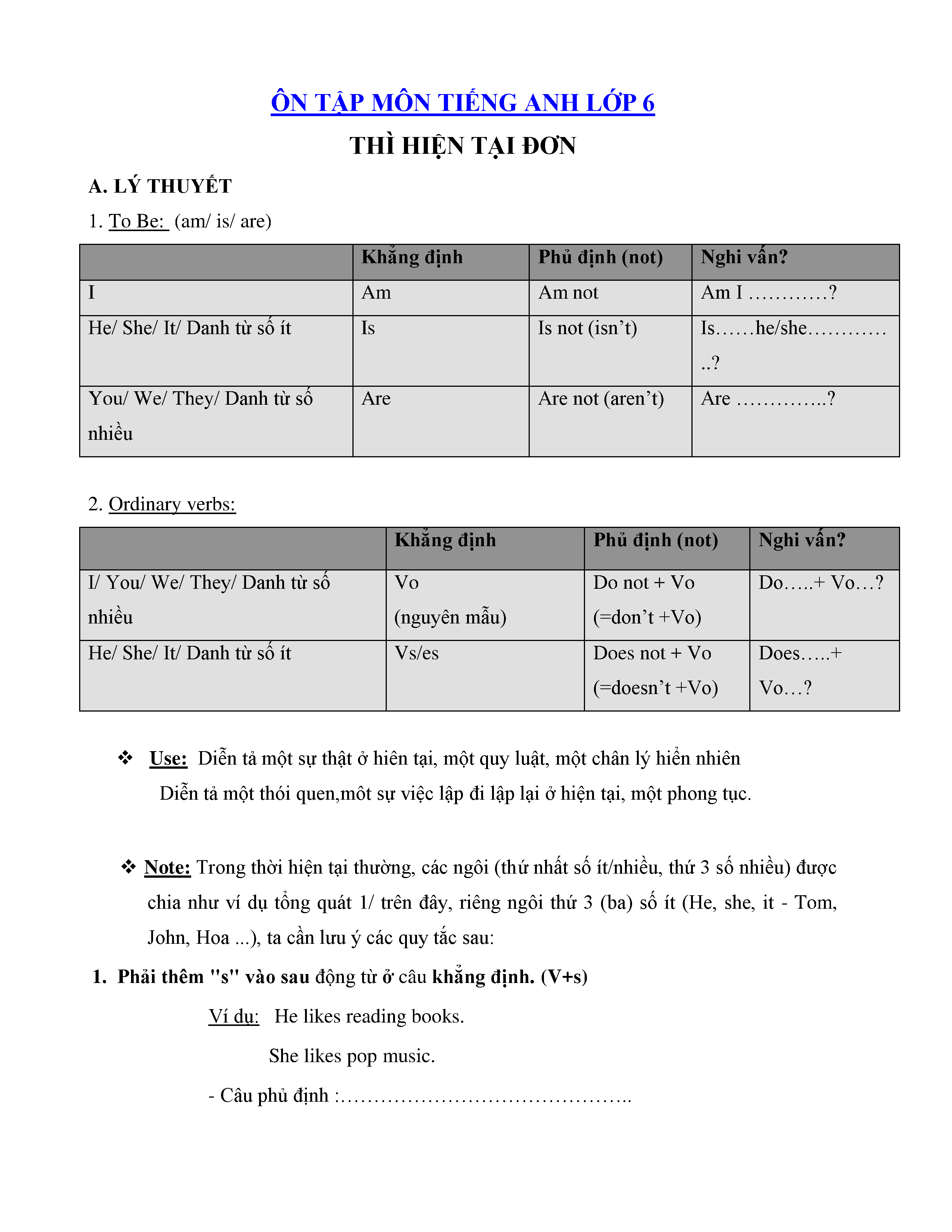 Tài liệu bài tập thì hiện tại đơn lớp 6