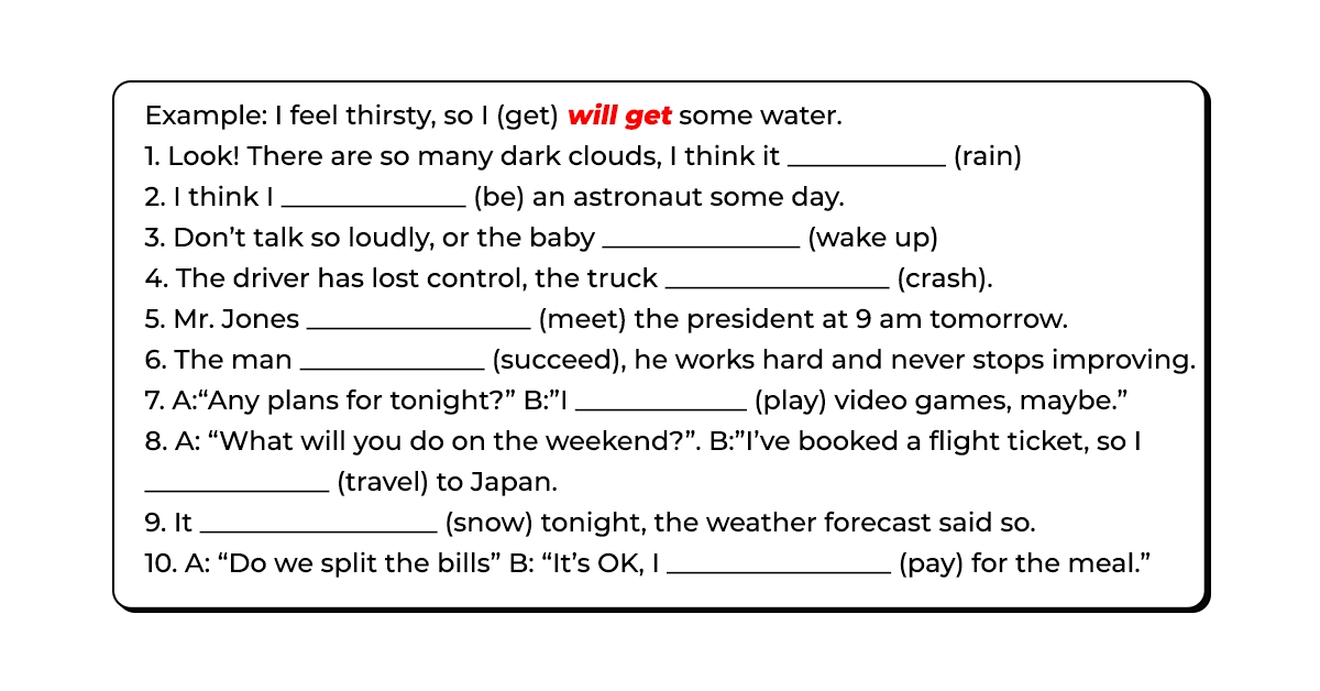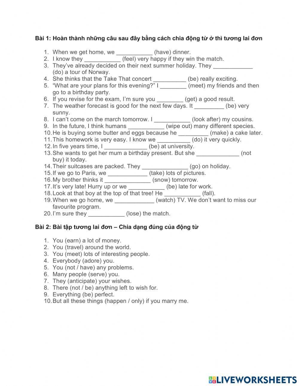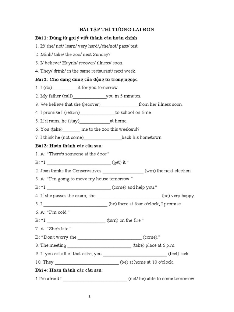 Ngoài ra, các bài tập này thường xuyên đan xen giữa lý thuyết và thực hành, giúp học sinh hiểu rõ hơn về cấu trúc và cách dùng của thì tương lai đơn. Đặc biệt, việc luyện tập sẽ giúp các em dễ dàng nhận diện và sử dụng đúng thì này trong các tình huống giao tiếp hàng ngày.
