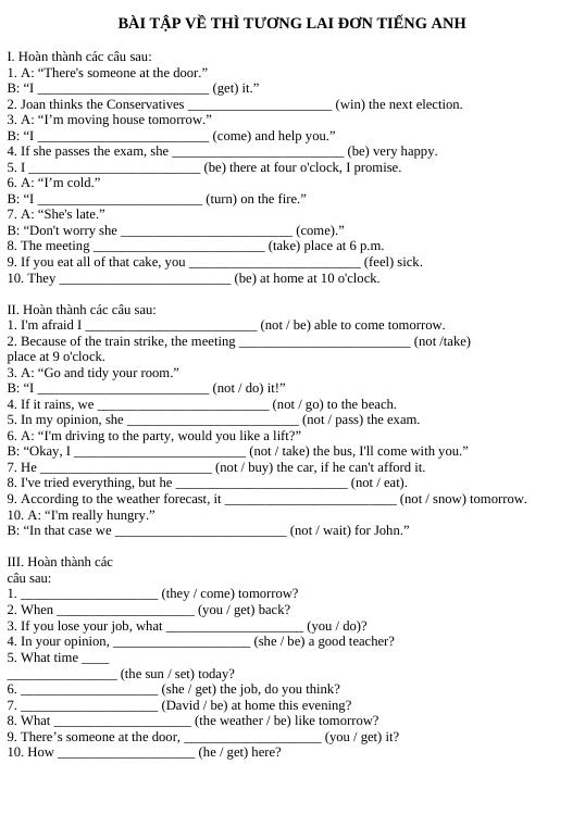 Bài tập thì tương lai đơn là một phần quan trọng trong việc học tiếng Anh, giúp học sinh nắm vững cấu trúc ngữ pháp và cách sử dụng thì này. Học sinh có thể tìm thấy rất nhiều bài tập hữu ích, bao gồm bài tập giao tiếp và ngữ pháp, giúp cải thiện khả năng sử dụng tiếng Anh hàng ngày.