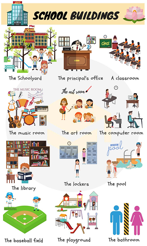 Ngoài các cấp học, những từ ngữ miêu tả cơ sở vật chất trong trường cũng rất cần thiết. Chẳng hạn như bảng viết được gọi là “board”, trong khi “book” là sách, “canteen” là khu nhà ăn, nơi học sinh có thể nạp năng lượng sau giờ học. Ghế ngồi trong lớp được gọi là “chair”, giúp học sinh thoải mái khi học tập.
