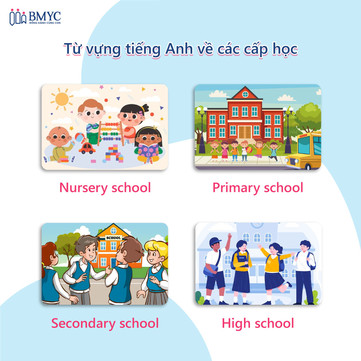 Trong tiếng Anh, từ “school” có nhiều từ vựng liên quan đến các cấp học khác nhau như “nursery school” (trường mầm non), “primary school” (trường tiểu học) và “secondary school” (trường trung học). Việc nắm rõ từ vựng này sẽ giúp bạn giao tiếp dễ dàng hơn khi nói về trường học và các hoạt động học tập.
