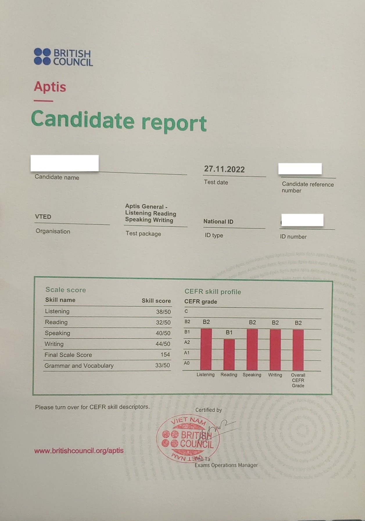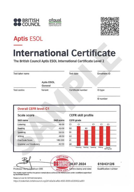 Aptis is a comprehensive English test developed by the British Council, designed to assess your skills across all four language areas: listening, speaking, reading, and writing. For a fee of just 2,000,000 VND, candidates can evaluate their English proficiency from basic levels (A1, A2) to advanced (B1, B2, C1, C2) based on the Common European Framework of Reference (CEFR).