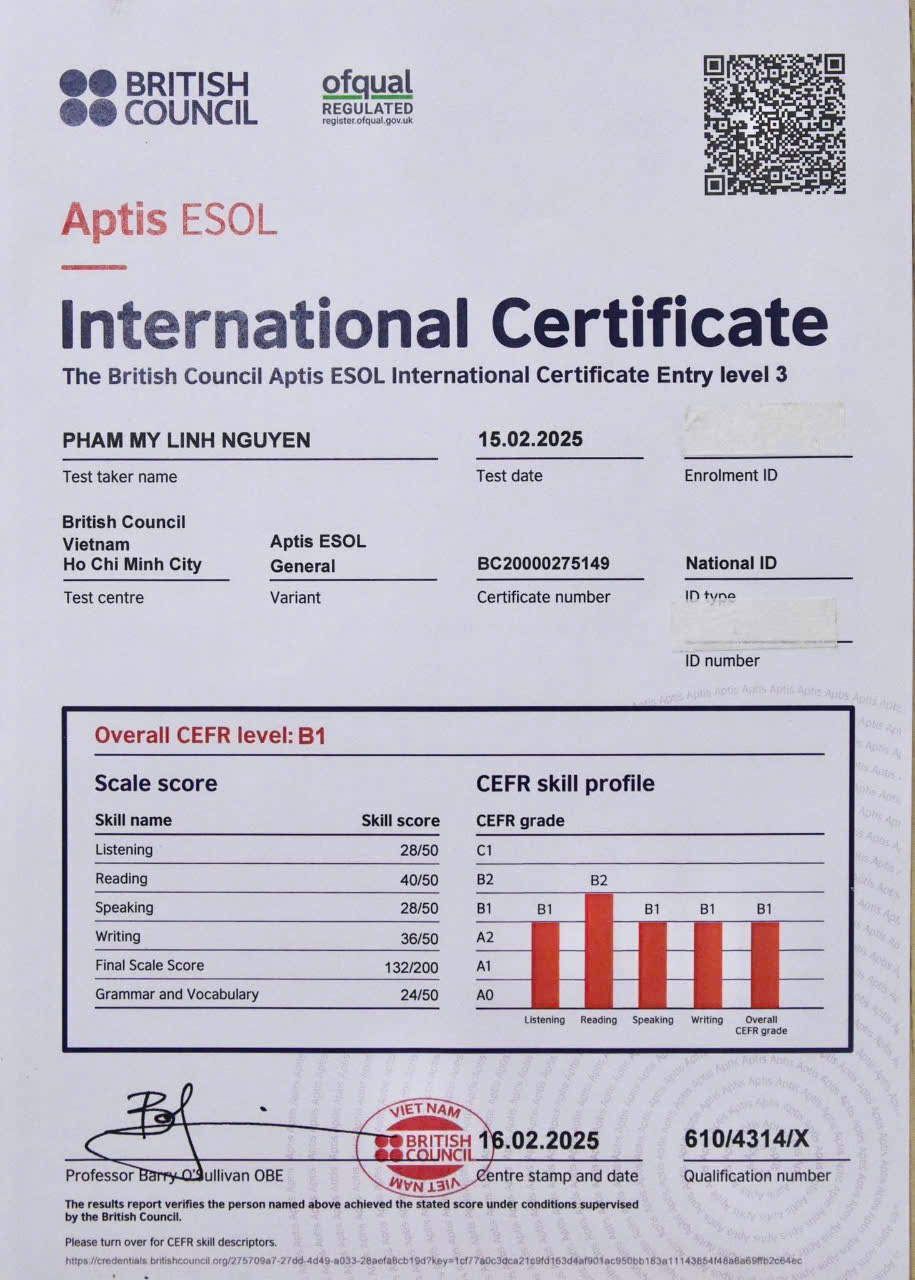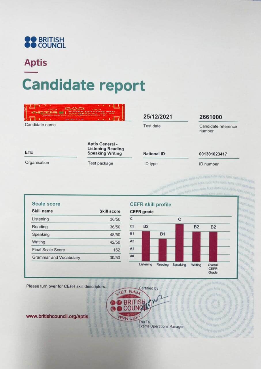 Khi hoàn thành bài thi Aptis, bạn sẽ nhận được chứng chỉ chứng minh năng lực tiếng Anh của mình, điều này có thể mở ra nhiều cơ hội mới trong học tập và sự nghiệp. Chứng chỉ này không chỉ được công nhận rộng rãi mà còn mang lại sự tự tin cho bạn khi giao tiếp bằng tiếng Anh.