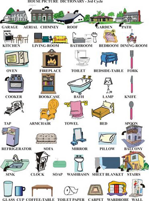 In the study area, chairs and tables are indispensable for working or studying. A wardrobe helps keep our clothes organized, and a television can provide relaxation after a long day. Understanding these English vocabulary words helps children learn about their surroundings more effectively and engage with their families.