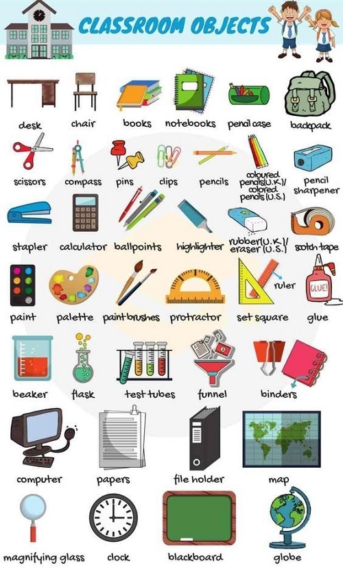 Khi học tiếng Anh, một phần quan trọng là nắm vững từ vựng về đồ dùng học tập. Điều này không chỉ giúp trẻ em giao tiếp tốt hơn mà còn giúp các bé dễ dàng thấy được các vật dụng xung quanh mình. Một số từ quen thuộc như “backpack” (ba lô) và “notebook” (sổ tay) thường được sử dụng hàng ngày.