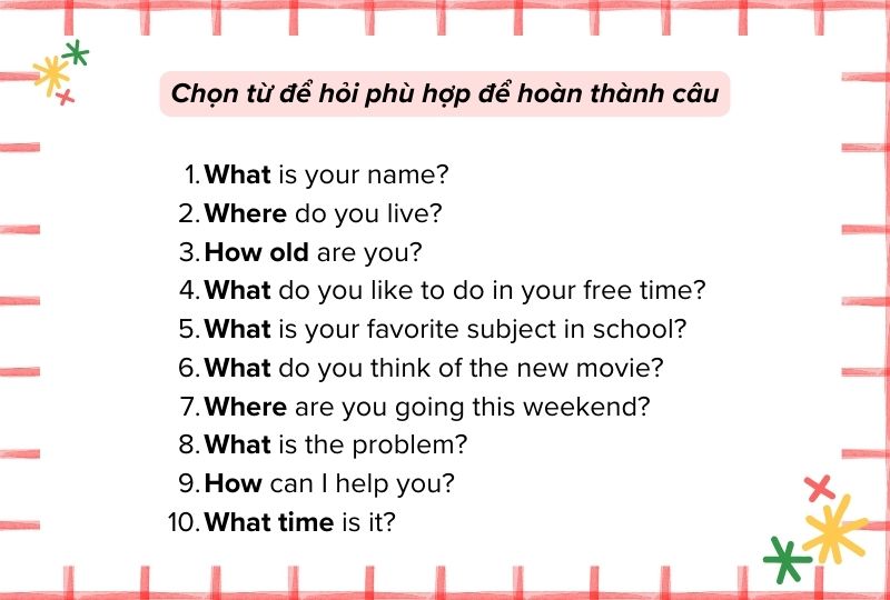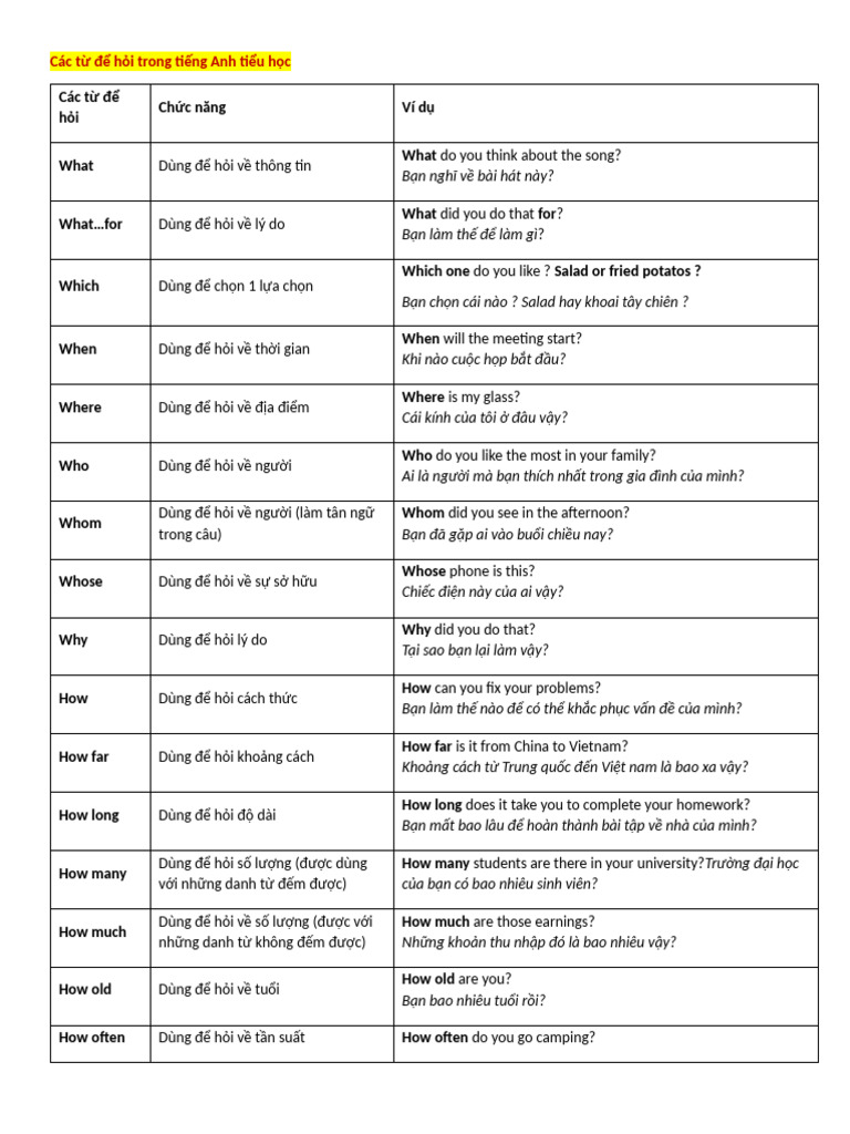 Mỗi từ hỏi đều có chức năng riêng, giúp chúng ta khám phá thế giới xung quanh và hiểu hơn về người khác. Việc nắm vững các từ để hỏi sẽ tạo điều kiện thuận lợi cho việc học tiếng Anh và giao tiếp hàng ngày.
