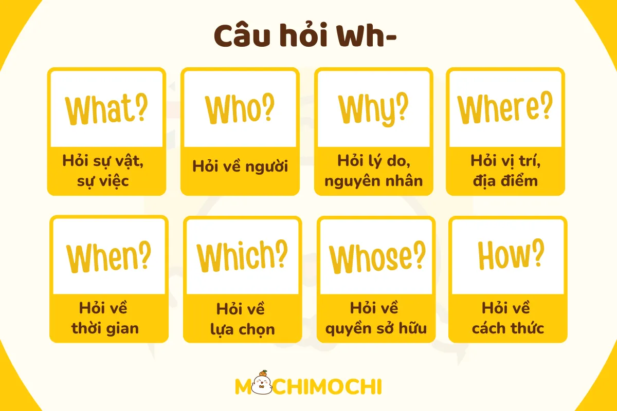 Câu hỏi Wh-Questions trong tiếng Anh là một phần quan trọng khi giao tiếp, giúp chúng ta tìm hiểu và khám phá thông tin một cách rõ ràng. Các từ để hỏi phổ biến như “Who”, “What”, “When”, “Where”, “Why”, “Which”, “Whose” và “How” đều mang đến những ý nghĩa khác nhau. Ví dụ, “Who” thường được dùng để hỏi về con người, như câu “Who are you?” (Bạn là ai?).
