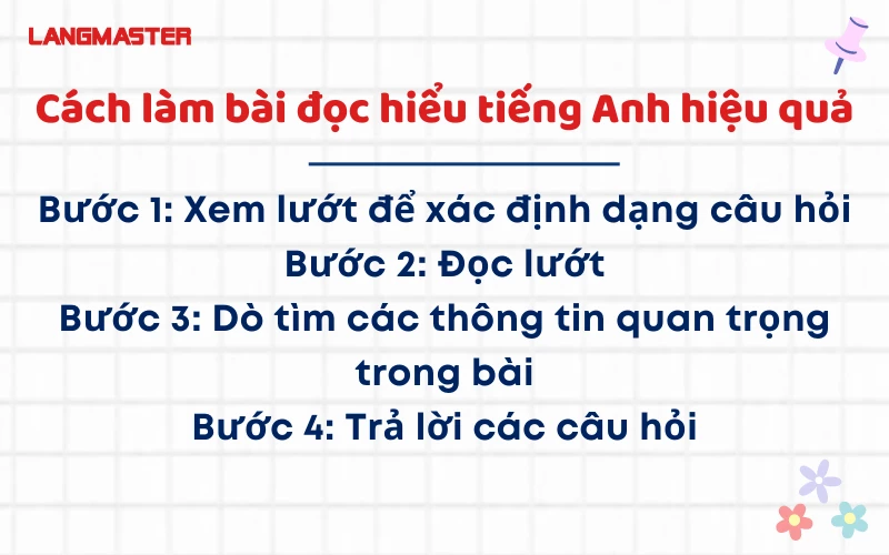 Trong phần làm bài đọc hiểu, có một số bước cơ bản mà bạn nên tuân theo. Đầu tiên, hãy đọc lướt qua đoạn văn để nắm bắt thông tin chính. Sau đó, xem xét các đáp án để định hình ý tưởng trước khi đọc kỹ từng câu. Điều này sẽ giúp bạn dễ dàng tìm ra câu trả lời cho các câu hỏi.