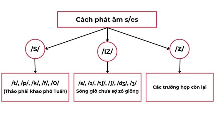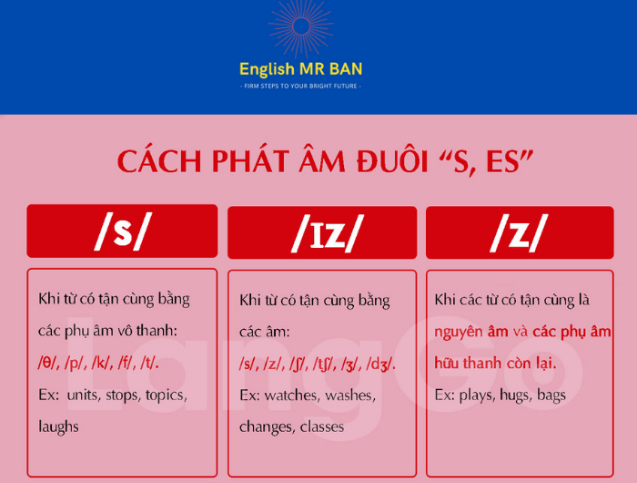 Đối với đuôi -s/es, cũng có những quy tắc riêng. Đuôi này được đọc là /s/ khi âm cuối của từ gốc là các âm vô thanh như /k/, /f/, /p/, /t/ hoặc /θ/. Ví dụ như từ “books” (/bʊks/) hay “help” (/hɛlp/). Ngược lại, khi âm cuối là âm /s/, đuôi -s sẽ được phát âm là /iz/.