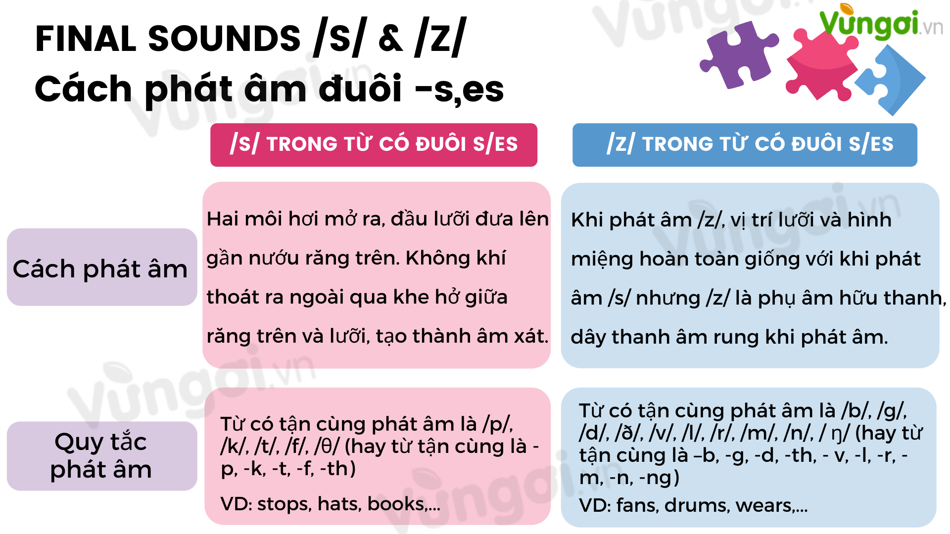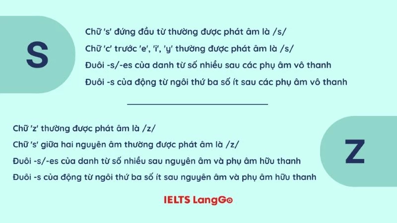 Cách phân biệt âm /s/ và /z/ khá dễ dàng với một số quy tắc. Chẳng hạn, nếu từ kết thúc bằng các phụ âm vô thanh như -p, -k, -t, -f, bạn sẽ phát âm là /s/. Ngược lại, nếu từ kết thúc bằng -s, -ss, -ch, -sh, -x, -z, hay -o, thì âm cuối sẽ là /iz/. Hãy chú ý đến những điểm này để phát âm chính xác hơn nhé!