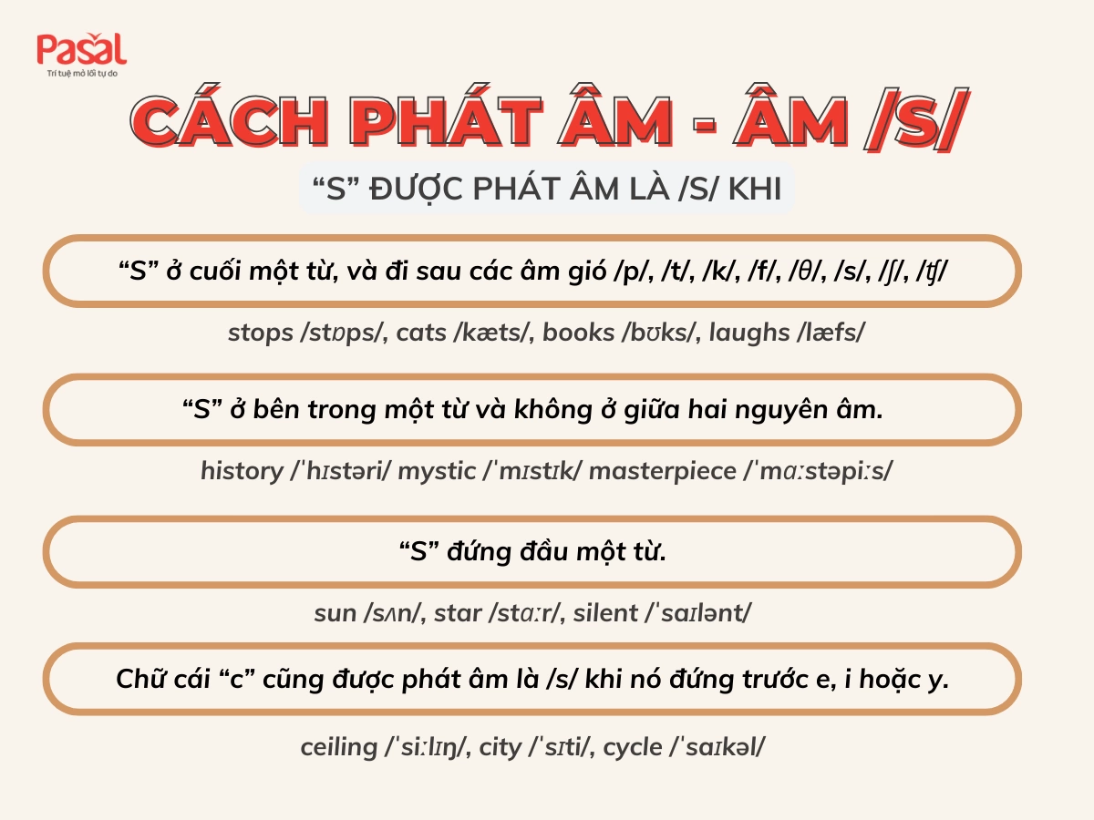 Bạn cũng nên nhớ rằng, âm /s/ được phát âm khi chữ S đứng đầu từ hoặc trong các từ mà trước đó là âm vô thanh như /p/, /t/, /k/, hoặc /f/. Việc nắm rõ các quy tắc này sẽ giúp bạn cải thiện khả năng phát âm và nghe hiểu tốt hơn.