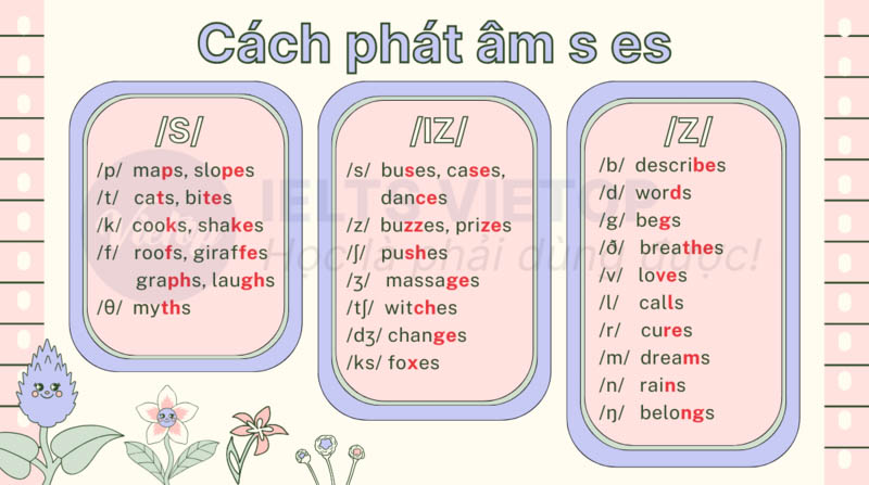 Các quy tắc phát âm cũng cần được lưu ý. Đuôi “-s” sẽ được phát âm là /s/ nếu từ kết thúc bằng các âm vô thanh như /f/, /t/, /k/,… Ngược lại, nếu từ kết thúc bằng âm hữu thanh, bạn sẽ phát âm là /z/. Đặc biệt, khi từ kết thúc bằng các âm /s/, /ʃ/, /z/, /dʒ/, việc thêm “-es” sẽ phát âm là /iz/.