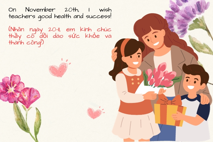 Ngày Nhà giáo Việt Nam là dịp để chúng ta bày tỏ lòng biết ơn đến những người đã truyền dạy kiến thức và kỹ năng cho mình. Đầu tiên, tôi muốn gửi đến quý thầy cô những lời chúc tốt đẹp nhất: “Wishing you a Teacher’s Day full of happiness!” Ngày hôm nay thật đặc biệt, và hy vọng rằng niềm vui sẽ luôn hiện hữu bên thầy cô.