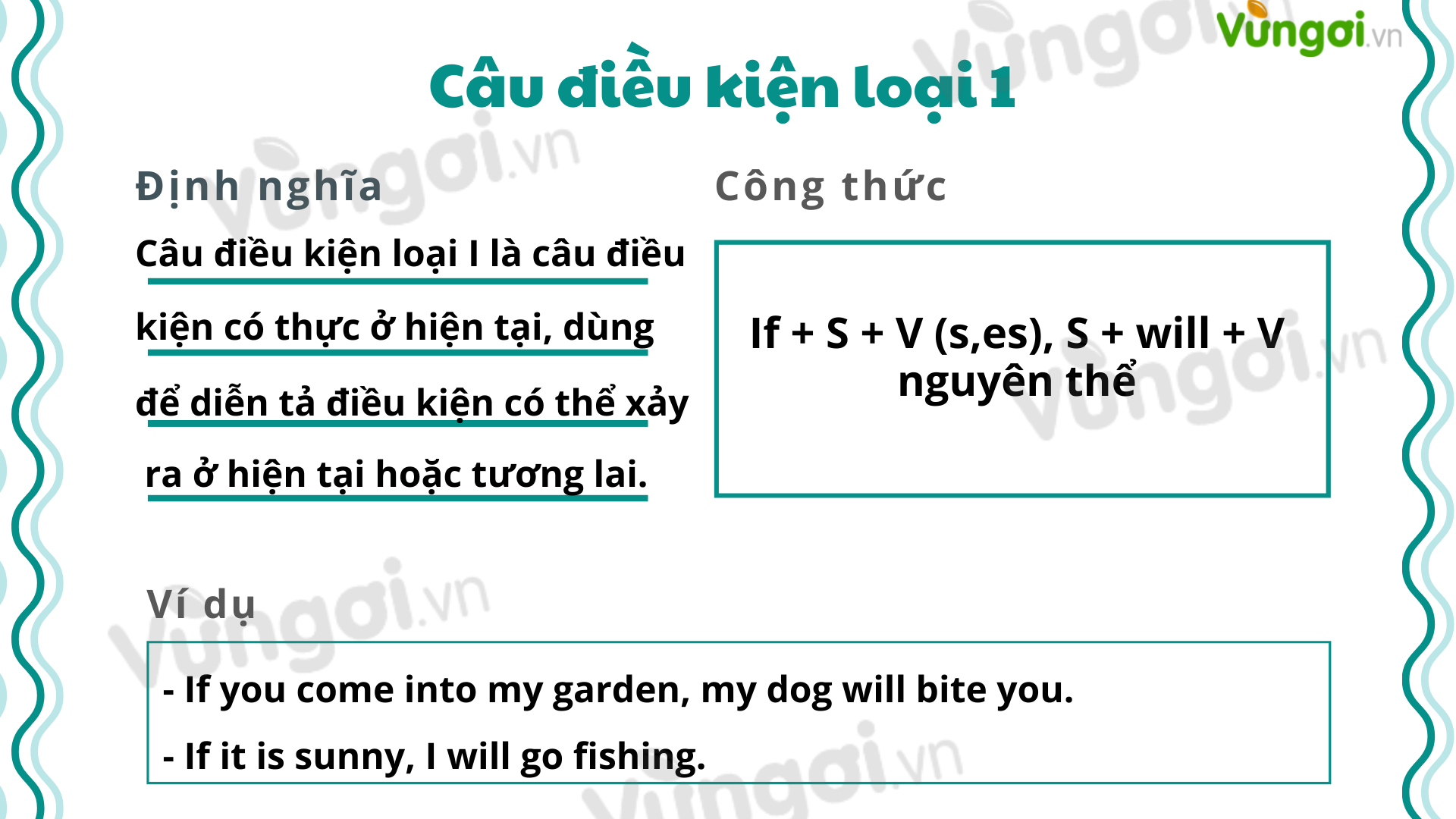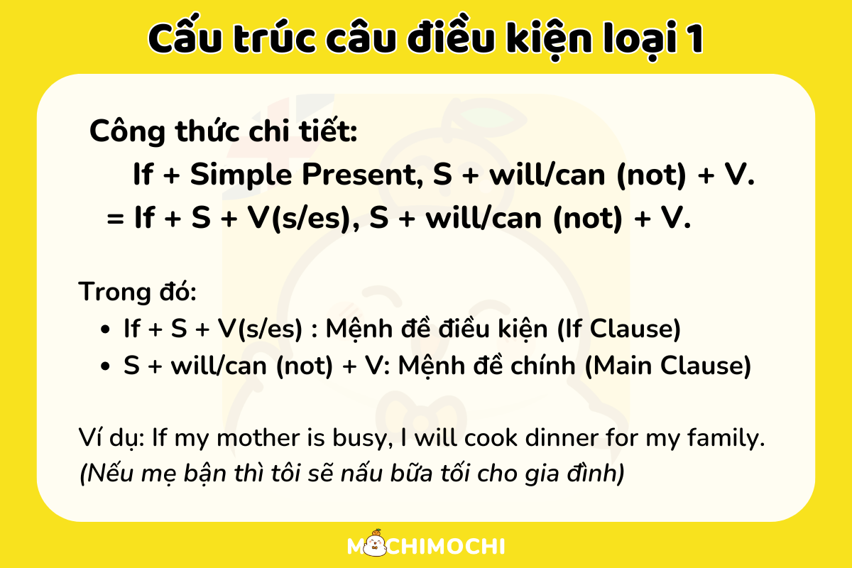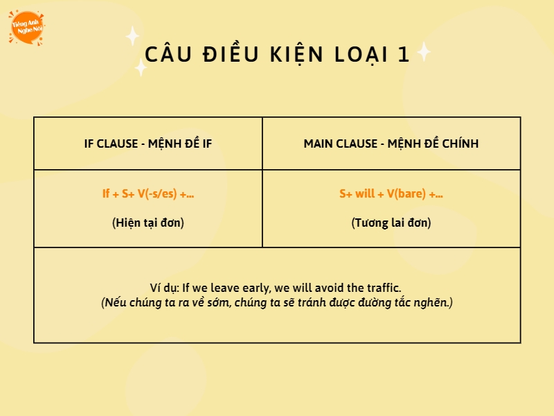Câu điều kiện loại 1 là một cấu trúc ngữ pháp quan trọng trong tiếng Anh, thường được sử dụng để diễn tả những tình huống có khả năng xảy ra trong hiện tại hoặc tương lai. Dấu hiệu nhận biết câu điều kiện này khá đơn giản: mệnh đề “if” sẽ sử dụng thì hiện tại đơn, trong khi mệnh đề chính sẽ được chia ở thì tương lai đơn với cấu trúc “will + động từ nguyên mẫu”.