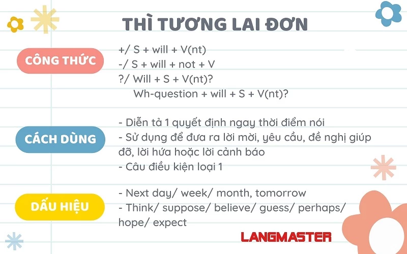 Trong chương trình tiếng Anh bậc Trung học cơ sở, việc nắm vững thì tương lai đơn là rất quan trọng. Thì tương lai đơn (Simple Future Tense) được sử dụng để diễn tả kế hoạch, dự đoán hay sự kiện sẽ xảy ra trong tương lai. Để giúp các em củng cố kiến thức, Langmaster đã biên soạn bộ bài tập phong phú gồm 50 bài tập lý thuyết và thực hành. Những bài tập này không chỉ bao gồm cách dùng và cấu trúc mà còn rất đa dạng, từ điền từ, đặt câu đến chọn đáp án đúng.