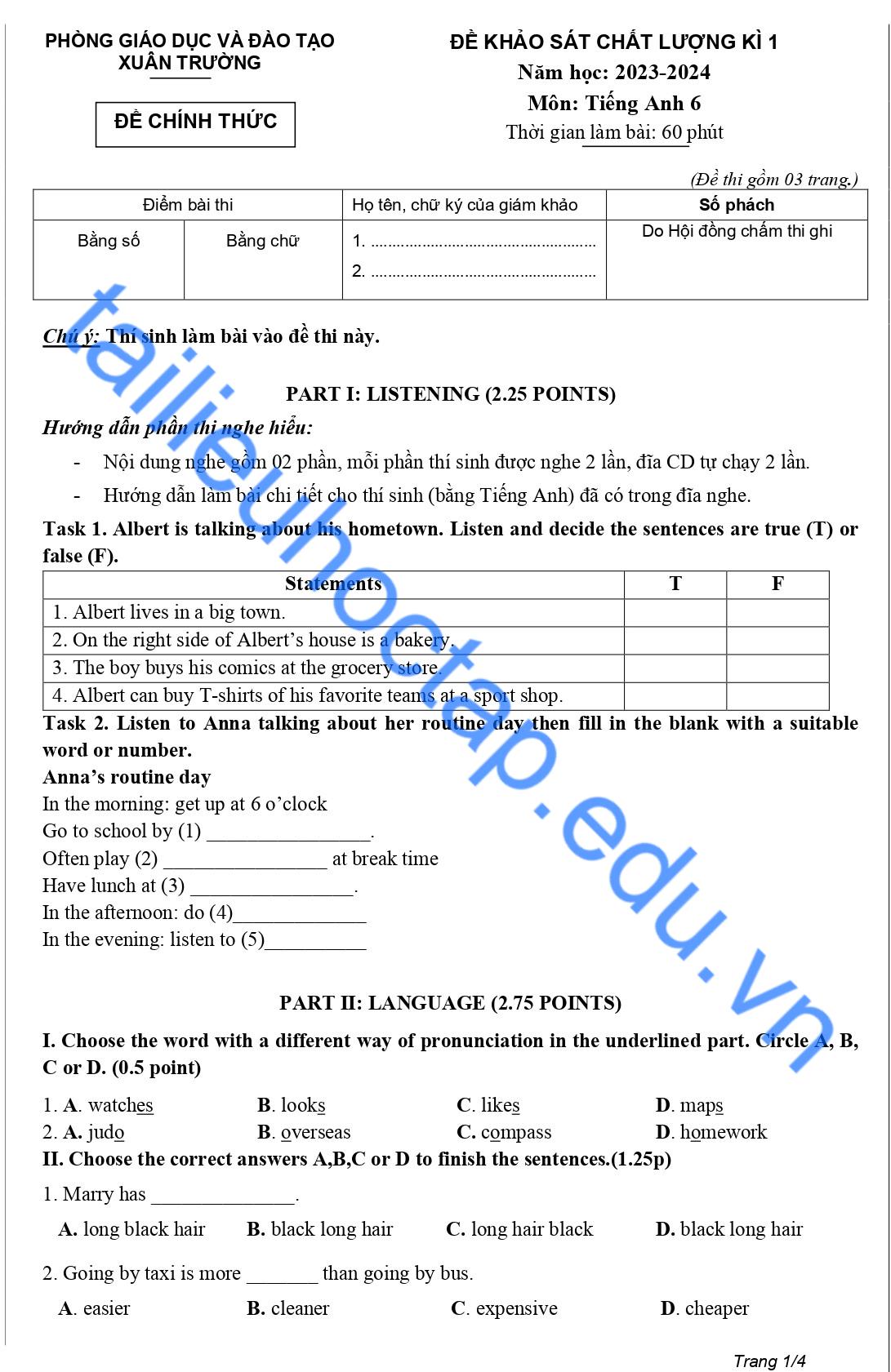 Đề thi thử tiếng Anh lớp 6 học kỳ 1 năm 2025 là một tài liệu hữu ích cho các bạn học sinh trong quá trình ôn tập và chuẩn bị cho kỳ thi. Bộ đề thi này bao gồm nhiều lựa chọn khác nhau như bộ đề Global Success, Friends Plus và iLearn, giúp học sinh có cái nhìn toàn diện về các dạng câu hỏi có thể xuất hiện.