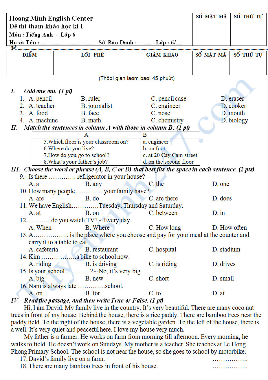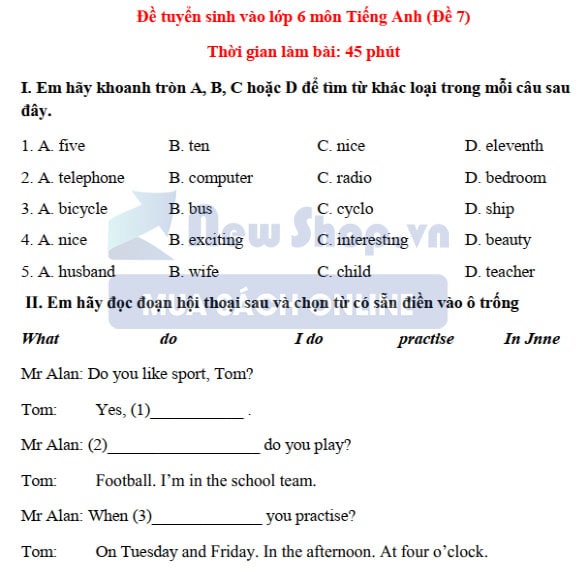 Đề thi thử tiếng Anh lớp 6 online là một công cụ hữu ích giúp các em học sinh ôn luyện và củng cố kiến thức. Với đa dạng các dạng bài, từ trắc nghiệm đến tự luận, các đề thi này không chỉ kiểm tra từ vựng mà còn cả ngữ pháp và kỹ năng giao tiếp. Thời gian làm bài là 45 phút, đây là cơ hội hoàn hảo để học sinh làm quen với áp lực thi cử.