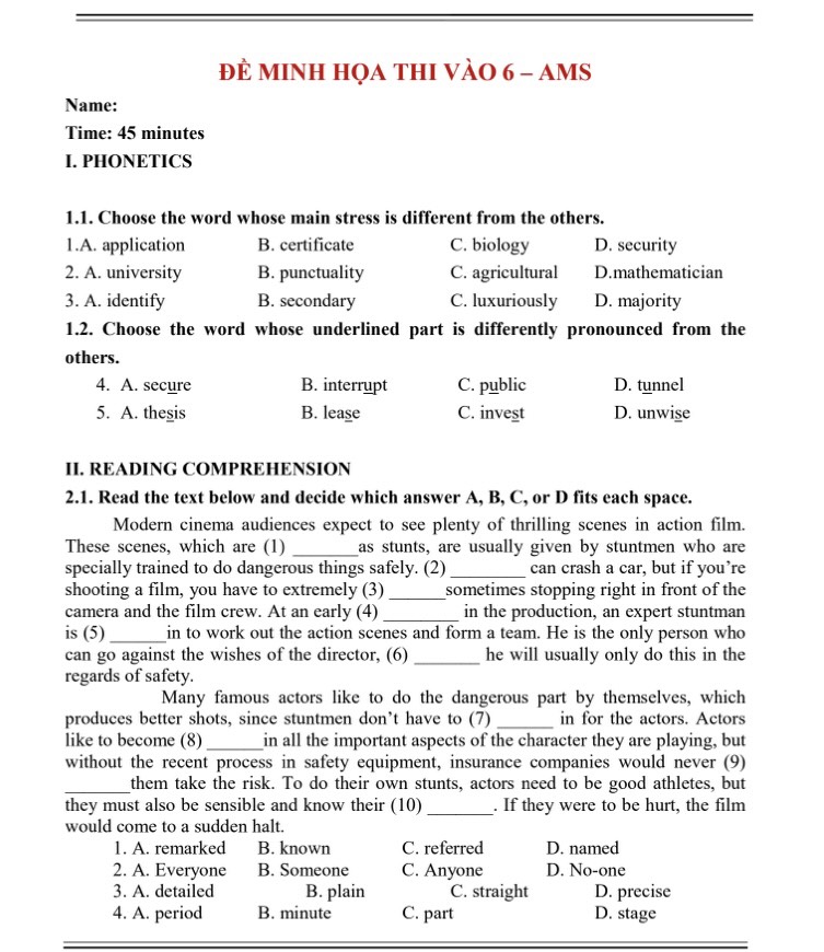 Bên cạnh đó, học sinh có thể tải về các đề thi dưới định dạng Word và PDF, thuận tiện cho việc ôn luyện. Bộ đề còn bao gồm nhiều dạng bài tập, từ phần ngữ âm cho đến ngữ pháp, giúp cải thiện toàn diện kỹ năng tiếng Anh. Chắc chắn rằng việc tham khảo những tài liệu này sẽ giúp các bạn tự tin hơn trong kỳ thi sắp tới. Chúc các bạn đạt điểm cao!