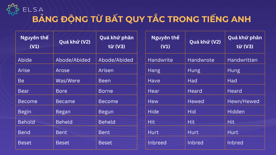 Một số ví dụ điển hình từ bảng này như “abide” trở thành “abode” hoặc “abided” ở quá khứ, hay “break” đổi thành “broke” và “broken”. Bảng động từ còn chứa rất nhiều động từ thông dụng khác như “bring – brought – brought” hay “blow – blew – blown”, giúp mở rộng vốn từ vựng của các bạn.