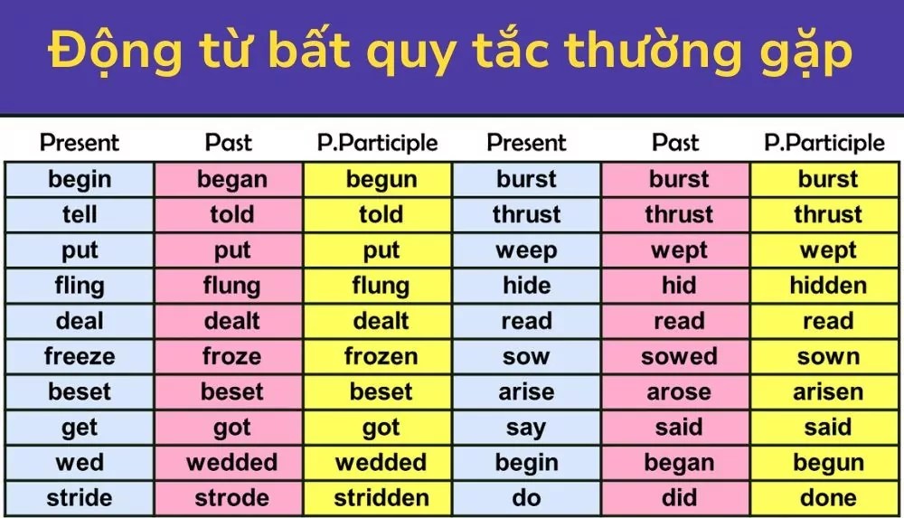 Động từ quá khứ bất quy tắc là một chủ điểm ngữ pháp quan trọng và không thể bỏ qua khi học tiếng Anh. Khác với các động từ có quy tắc, động từ bất quy tắc không tuân theo một quy luật nào nhất định khi chuyển sang dạng quá khứ, khiến nhiều người học gặp khó khăn trong quá trình ghi nhớ và sử dụng. Để giúp bạn nắm vững kiến thức này, bài viết sẽ cung cấp bảng động từ bất quy tắc, cách học hiệu quả, ví dụ minh họa, bài tập luyện tập, cũng như tổng hợp các động từ thường gặp và những mẹo ghi nhớ đơn giản, dễ áp dụng.