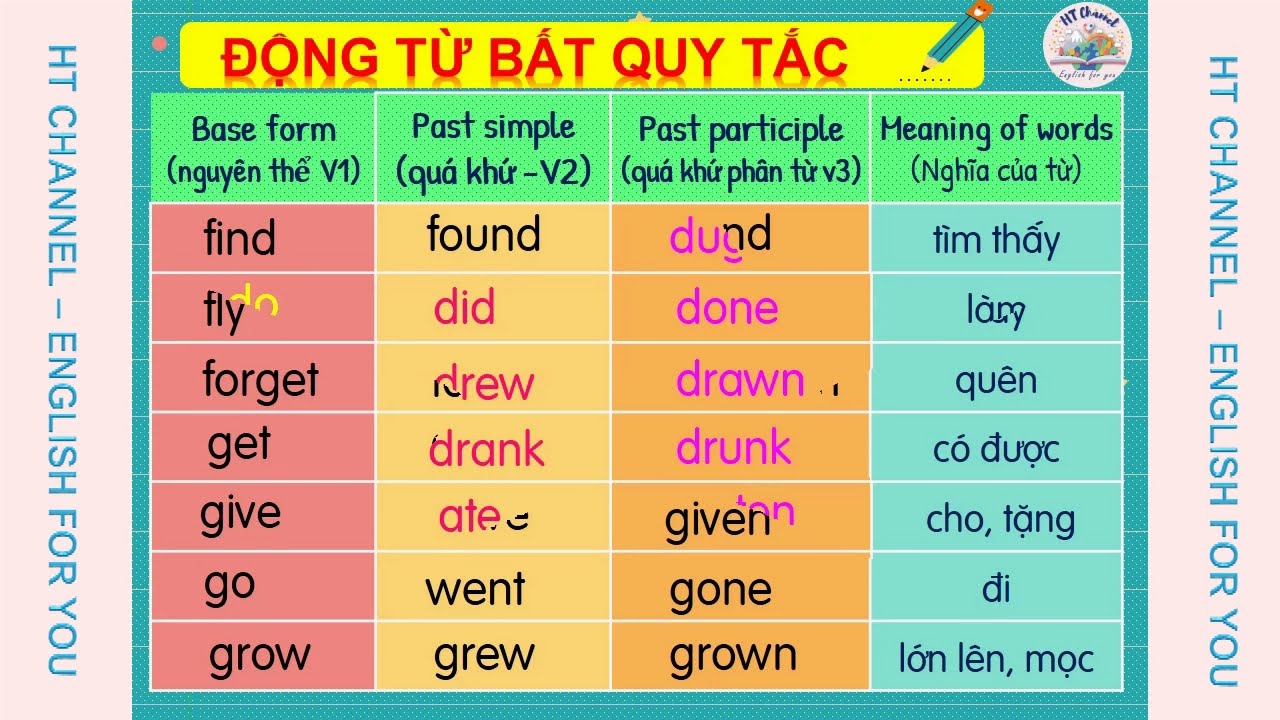 Động từ là một phần thiết yếu trong ngữ pháp tiếng Anh, và việc nắm vững cách chia động từ bất quy tắc là rất quan trọng. Trong khi các động từ quy tắc chỉ cần thêm “-ed” ở dạng quá khứ, các động từ bất quy tắc lại không tuân theo quy tắc này. Chẳng hạn, động từ “go” có dạng quá khứ là “went”, hoàn toàn khác với cách chia thông thường.