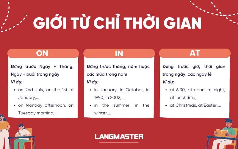 Trong tiếng Anh, giới từ chỉ thời gian đóng vai trò quan trọng trong việc xác định thời điểm xảy ra của sự việc, đồng thời giúp câu văn trở nên rõ ràng và logic hơn. Tuy nhiên, nhiều người học tiếng Anh vẫn thường nhầm lẫn cách sử dụng các giới từ như in, on, at,… do có những điểm giống và khác nhau tinh tế. Ở bài viết này, chúng ta sẽ cùng tìm hiểu chi tiết về các loại giới từ chỉ thời gian, cách dùng, ví dụ minh họa, bài tập thực hành, cũng như phân biệt và lưu ý khi sử dụng để giao tiếp và viết tiếng Anh chính xác hơn.