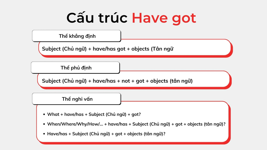 Cấu trúc “have got” trong tiếng Anh thường được sử dụng để diễn tả sự sở hữu, tương tự như động từ “have”. Công thức cơ bản của cấu trúc này là: S + have/has got + object. Ví dụ, trong câu khẳng định, ta có thể nói “I have got a new car” (Tôi có một chiếc xe mới).