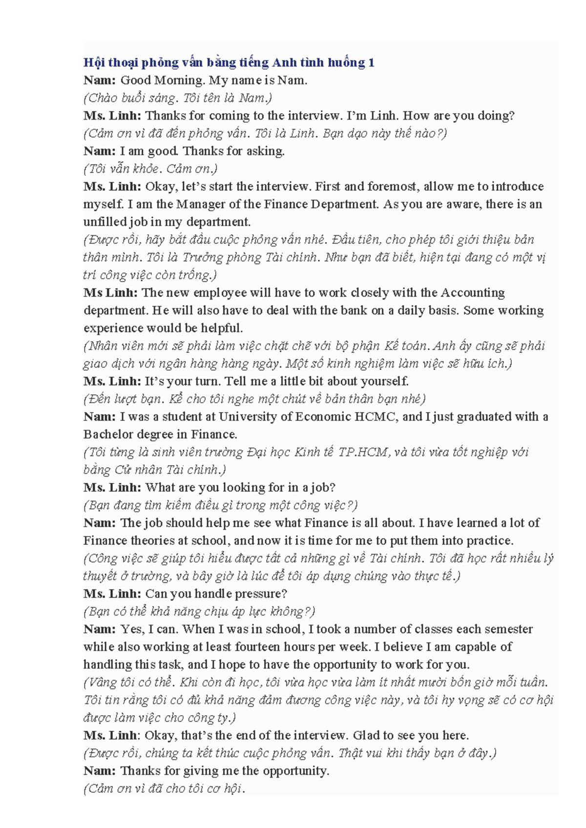 Hội thoại phỏng vấn xin việc là một phần quan trọng trong quá trình tìm kiếm việc làm. Một bữa phỏng vấn điển hình bắt đầu bằng những lời chào hỏi nhẹ nhàng, như “Hello! Welcome to ABC Company. Please have a seat.” Người xin việc thường cảm thấy hồi hộp nhưng cố gắng tạo ấn tượng tốt ngay từ đầu.