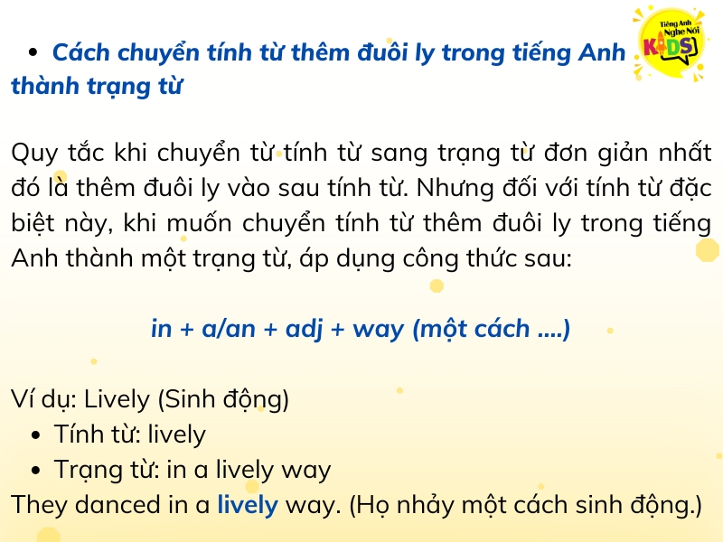 Khi học tiếng Anh, một trong những điều quan trọng là biết cách chuyển đổi từ tính từ sang trạng từ một cách chính xác. Phương pháp đơn giản nhất là thêm đuôi -ly vào sau tính từ. Ví dụ, từ “bad” khi thêm đuôi -ly sẽ trở thành “badly,” hay “easy” sẽ thành “easily.” Điều này giúp bạn diễn đạt hành động một cách dễ dàng và tự nhiên hơn.