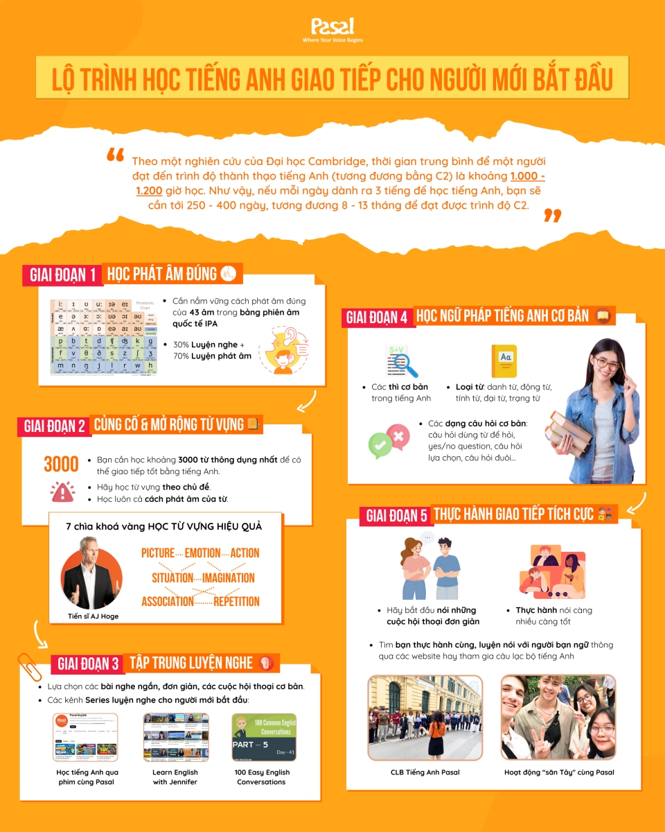 Học tiếng Anh giao tiếp không phải là một hành trình dễ dàng, nhưng với lộ trình hợp lý, bạn hoàn toàn có thể tiến bộ nhanh chóng. Đầu tiên, hãy bắt đầu với giai đoạn học phát âm và hội thoại cơ bản. Giai đoạn này giúp bạn quen dần với âm thanh và cách thức giao tiếp trong tiếng Anh, từ đó xây dựng nền tảng vững chắc.