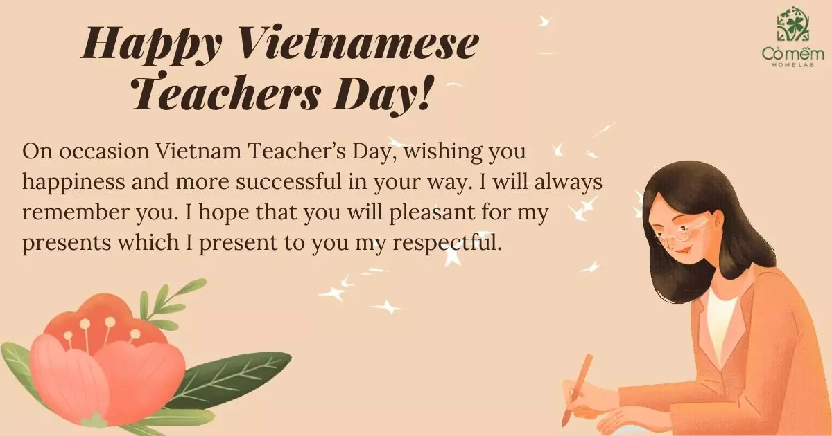 Happy Vietnam Teacher’s Day! On this special occasion, I want to express my heartfelt wishes for you to have a day filled with laughter and love from your students. Your dedication and passion for teaching shine through every lesson. We appreciate every moment you’ve spent nurturing us, just like a caring mother.