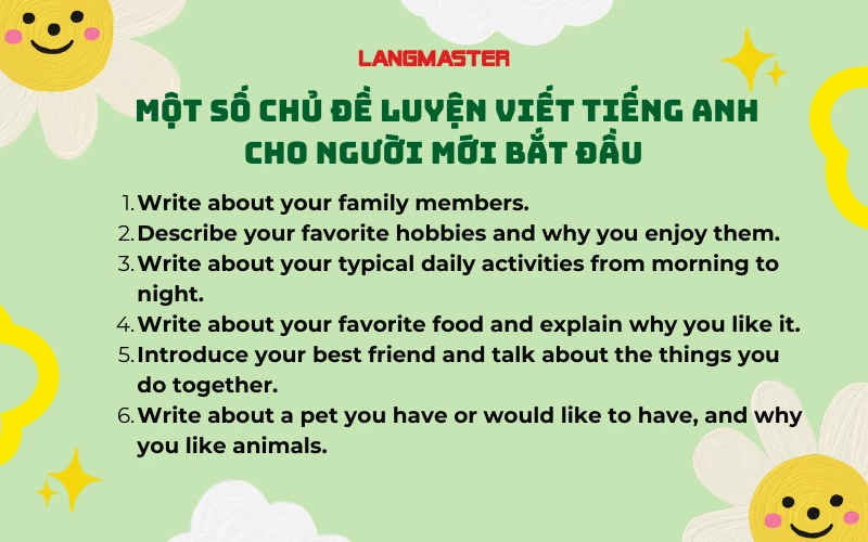 Hôm nay, cùng Langmaster khám phá 33 chủ đề luyện viết tiếng Anh cơ bản rất thú vị! Những chủ đề này rất phù hợp cho những người mới bắt đầu, giúp bạn trau dồi kỹ năng viết một cách hiệu quả. Các chủ đề quen thuộc như bản thân, gia đình, sở thích… không chỉ đơn giản mà còn dễ tiếp cận, giúp bạn cảm thấy tự tin hơn khi viết.