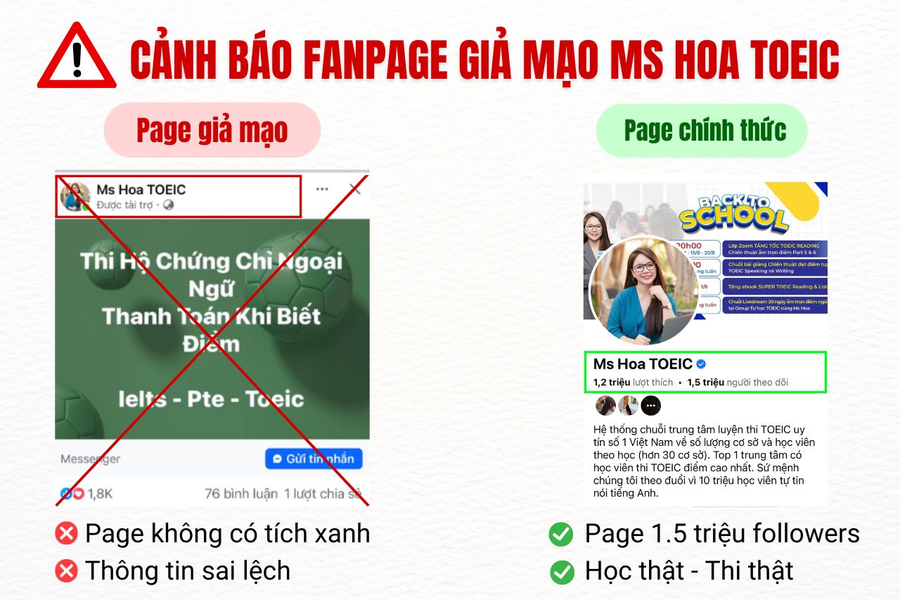 Thực tế, hiện nay trên mạng xã hội Facebook xuất hiện nhiều fanpage giả mạo mang danh “Ms Hoa TOEIC”. Những trang này không chỉ phát tán thông tin sai lệch mà còn thực hiện các hình thức lừa đảo tinh vi nhằm chiếm đoạt tài sản của các học viên. Cô Hoa đã lên tiếng cảnh báo về việc này, khẳng định rằng cô không liên quan đến các fanpage giả mạo ấy.