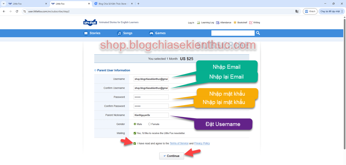 Để tạo tài khoản, bạn cần truy cập vào trang web của Little Fox và chọn loại tài khoản mong muốn. Sau đó, điền thông tin cá nhân theo hướng dẫn. Lưu ý rằng tài khoản chính sẽ là của phụ huynh, người có quyền thêm tối đa 3 người dùng trẻ em vào tài khoản.