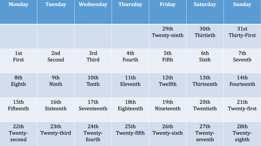 Trong tiếng Anh, việc đọc và viết ngày tháng thường dựa trên số thứ tự, hay còn gọi là ordinal numbers. Ví dụ, ngày 1 được đọc là “first,” ngày 2 là “second,” và ngày 3 là “third.” Tuy nhiên, có một số ngoại lệ như ngày 11 và 12, mà chúng ta đọc là “eleventh” và “twelfth.” Điều này rất quan trọng khi bạn muốn nói về một ngày cụ thể trong tháng.