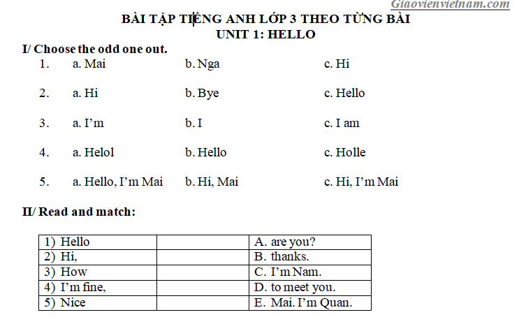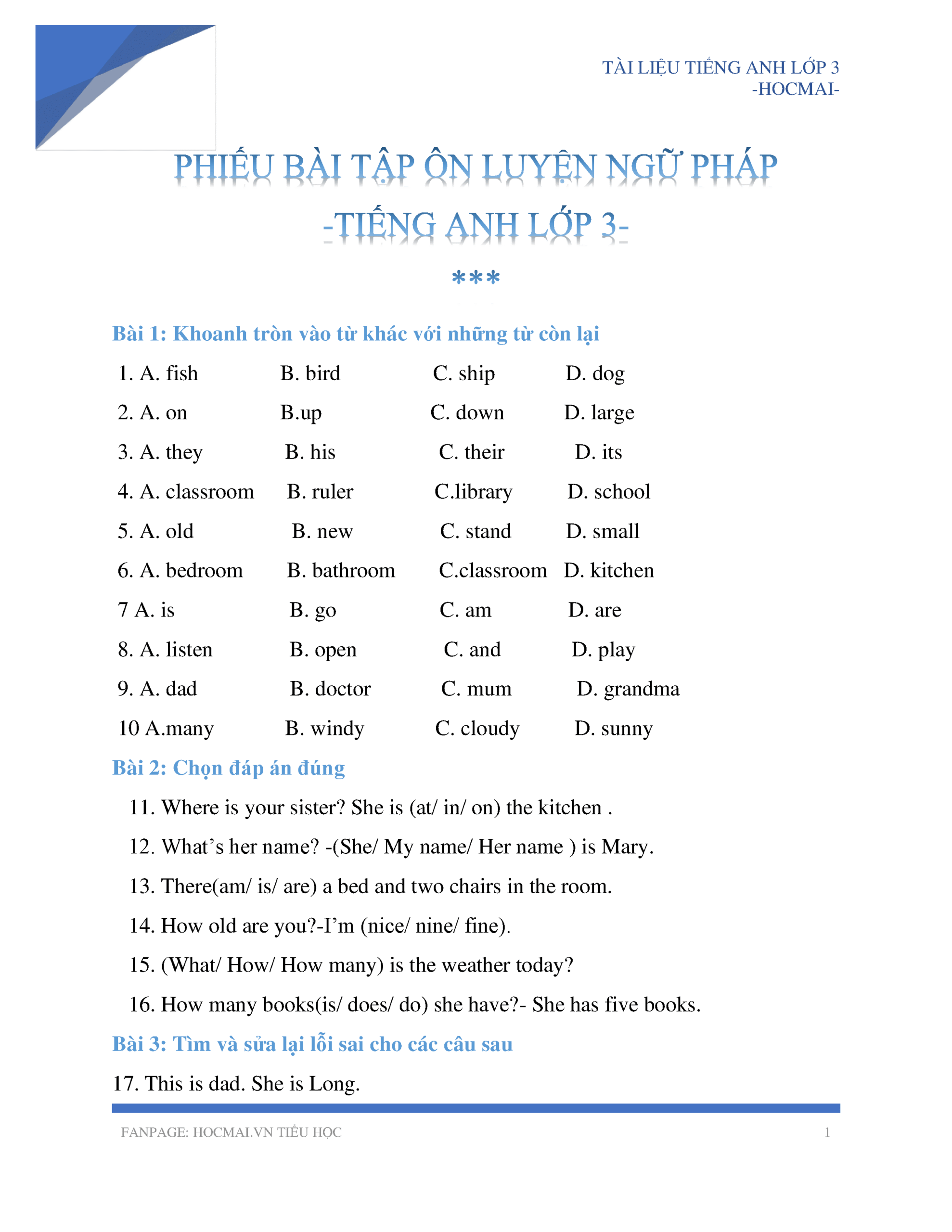 Bài tập ôn tập tiếng Anh lớp 3 là một phần quan trọng giúp các em học sinh củng cố kiến thức và chuẩn bị cho các kỳ thi. Trong bài viết này, chúng tôi tổng hợp 12 dạng bài tập tiếng Anh thường gặp, kèm theo đáp án để phụ huynh và các con có thể luyện tập ngay tại nhà. Các bài tập được thiết kế phong phú, từ việc chọn từ khác loại đến tìm lỗi sai, giúp trẻ tiếp cận ngữ pháp và từ vựng một cách hiệu quả.