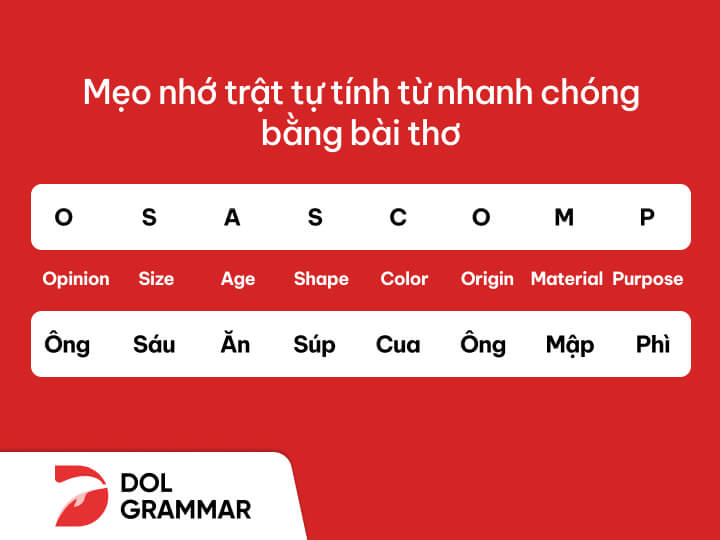 Trong tiếng Anh, trật tự sắp xếp tính từ rất quan trọng, và quy tắc OSASCOMP giúp người học nhớ dễ dàng hơn. Quy tắc này bao gồm tám loại tính từ: Opinion (Ý kiến), Size (Kích cỡ), Age (Tuổi), Shape (Hình dạng), Color (Màu sắc), Origin (Xuất xứ), Material (Chất liệu) và Purpose (Mục đích). Để dễ ghi nhớ thứ tự này, bạn có thể sử dụng câu hài hước: “Ông Sáu Ăn Súp Cua Ông Mập Phì.”